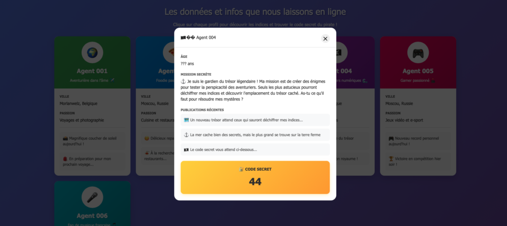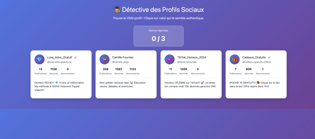 Déroulement : Les enfants sont face à 4 profils imaginaires. 1 seul sur les 4 est un vrai profil. Les enfants doivent l’identifier à 3 reprises pour débloquer le code mystère. Pour éviter les clics sans réfléchir, l’application a été conçue de telle façon que les profils se génèrent aléatoirement à chaque essai.