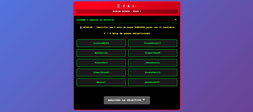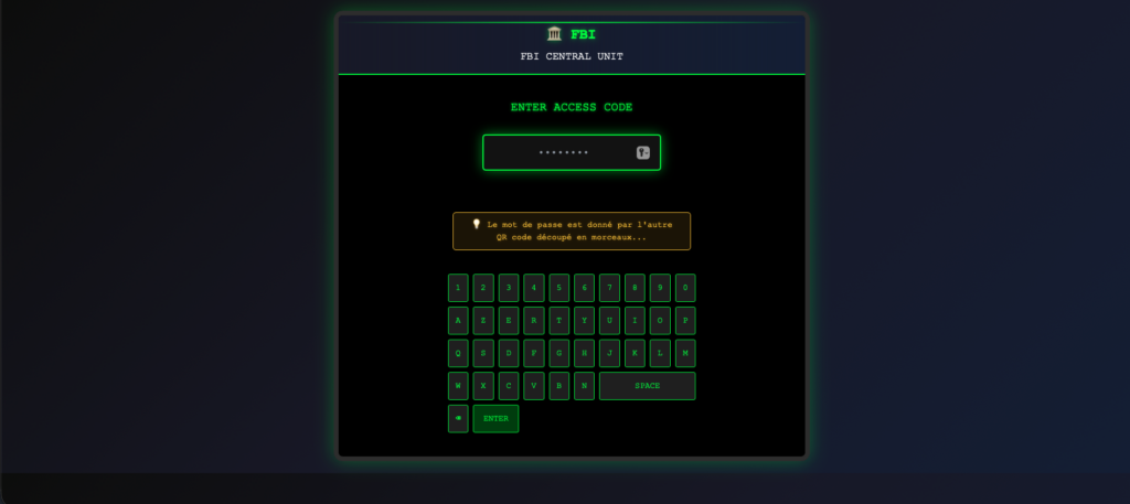 Déroulement : Les enfants doivent classer des mails en 2 groupes et séparer ainsi les vrais des faux. En assemblant les 2 QR codes, ils obtiendront 2 liens différents : Le premier mène vers un Learning apps de classement de mails (couriels/spams) donnant le mot de passe. Le second donne accès à l’unité centrale du FBI (où il faut introduire le mot de passe et découvrir le code secret)