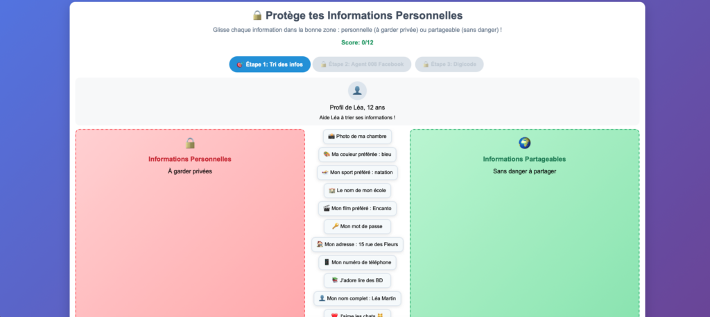 Déroulement : 3 tâches attendent les enfants : tout d’abord, ils devront trier des informations suivant le classement « données privées / données publiques ». Ensuite, ils devront repérer dans le profil Facebook de l’agent 008 les données qu’il n’aurait pas dû partager. Finalement, ils déverrouilleront un coffre fort grâce à un mot de passe que l’agent a laissé traîner sur son profil (et sur une carte d’accès).