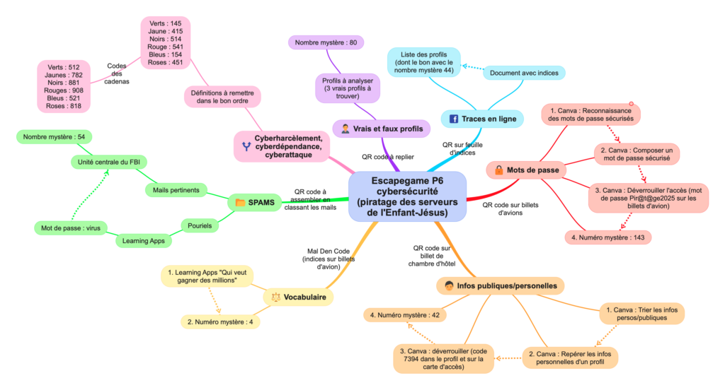 Je vous propose ici un escape game que j’ai créé moi-même à destination des 6e année primaire. Ce jeu, qui peut se jouer jusqu’à 6 équipes de 4 ou 5 personnes, permet d’aborder plusieurs attendus et compétences du programme de P6 dans le domaine de la cybersécurité. Nous y parlerons en effet de mots de passe, de données privées et publiques, des traces que nous laissons en ligne, des réseaux sociaux, et d’autres mots de vocabulaire. Je vous propose ici mon déroulement ainsi que l’explication complète du jeu, ainsi que tout le matériel pour vous aussi le réaliser en classe 😉